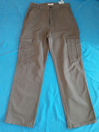 Pantalón de estilo cargo en color verde, perfecto para un look casual. - Diseño con múltiples bolsillos. - Cintura con trabillas para cinturón. - Cierre de botón y cremallera.