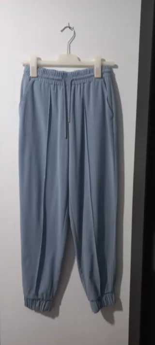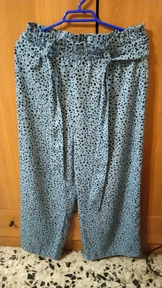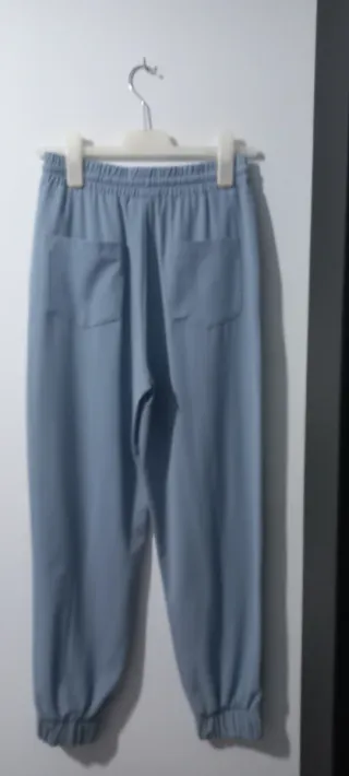 Pantalón mujer vestir para entretiempo, color gris claro muy bonito, cómodos permiten mucho movimiento, se adapta bien porque tiene elastán, cintura ancha elástica, bolsillos delanteros para usar y los de detrás son solo decorativos, tejido no sé composición corté etiqueta, es algo cálido y grueso, será viscosa, elastán y poliéster, algo así, marca Stradivarius, talla XL. Elegante y casual
