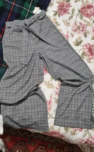 Pantalones palazzo de Stradivarius, talla XXS/32/4. Son de color beige verdoso, quizás en la última foto se vea el color más exacto (no sé por qué salen más oscuros en el resto de fotos). Tienen un corte amplio y fluido. Cintura elástica. Tejido ligero. Muy poco uso. Impecables.