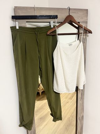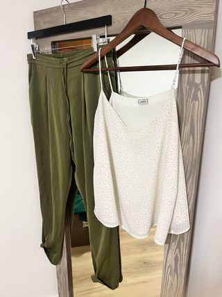 Conjunto de dos piezas. - Pantalón largo color verde oliva. - Top corto blanco con estampado de puntos.