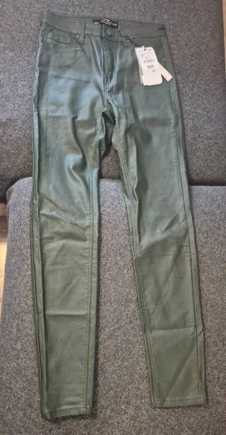 Pantalón de efecto piel en color verde. Corte ajustado. - Cierre de cremallera y botón. - Bolsillos delanteros y traseros. Tiro 24 5cm Largo 92cm Nuevo, con etiqueta
