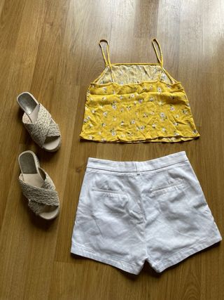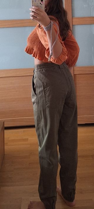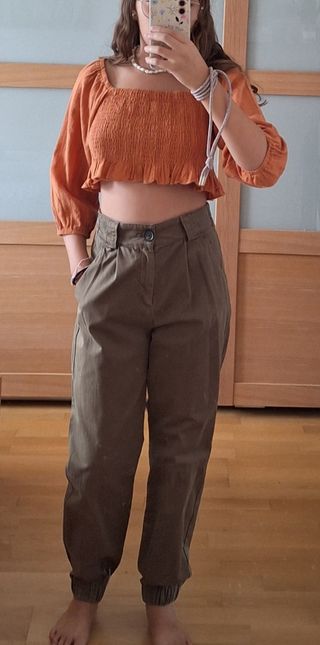 Conjunto de dos piezas con colores inspirados en el otoño. - Top con escote cuadrado y manga abullonada. - Pantalón tipo cargo con cintura elástica. (tiene una pequeña mancha, adjunto foto) solo envíos