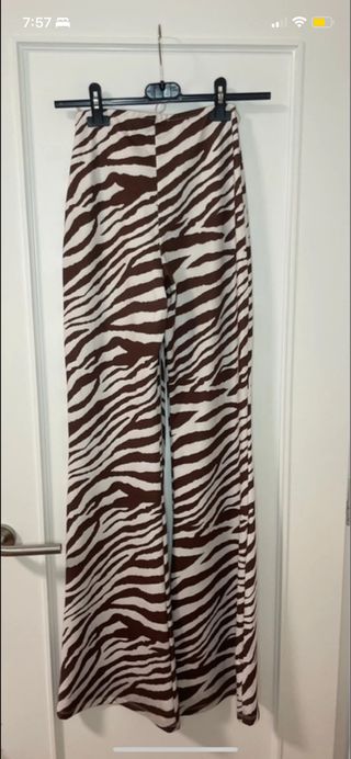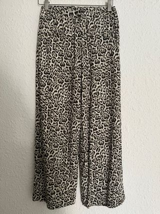 Pantalón con un llamativo estampado de animal print. - Diseño de pierna ancha. - Cintura alta con cierre de botón y cremallera.