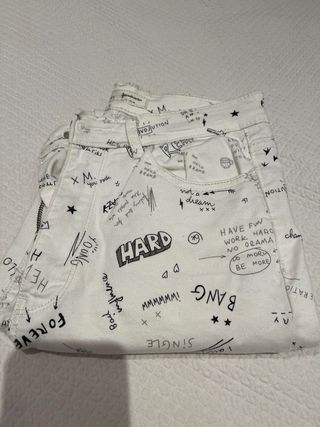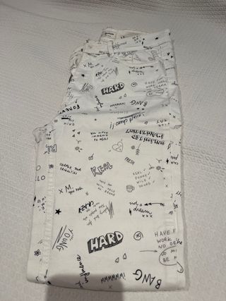 Pantalones blancos de la marca Pimkie con un divertido estampado de dibujos y frases. - Estampado de graffiti en negro. - Corte moderno. - Perfectos para un look casual y atrevido.