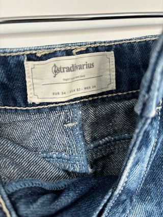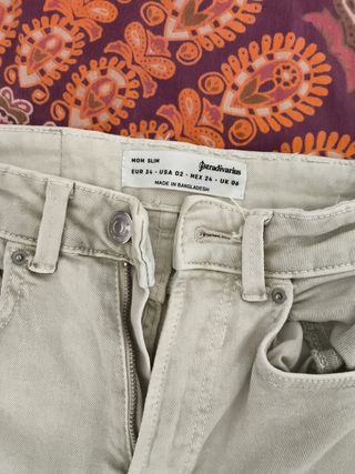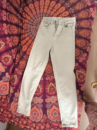 Pantalones vaqueros mom Slim de Stradivarius en color verde muy muy clarito. Son una prenda elegante y cómoda, ideal para cualquier ocasión. - Talla XS (EUR 34 - USA 02 - MEX 24 - UK 06) - Corte mom slim - De tiro alto - En perfecto estado salvo por la mancha que se ve en las fotos, en la parte de atrás