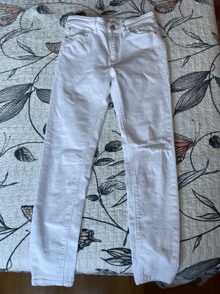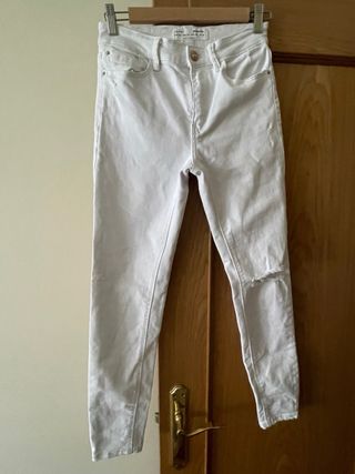 Pantalones vaqueros blancos de Stradivarius, talla 38. Son de tiro alto y corte pitillo. Tienen un pequeño desgarro en una rodilla, que le da un toque moderno. - Diseño de cinco bolsillos. - Cierre con cremallera y botón. - Tejido de algodón.