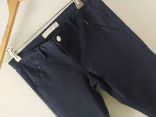 63% algodón. Talla 38. 5 bolsillos, cremallera y botón de cierre. Hebillas para cinturón. Queda pegado, es algo elástico.