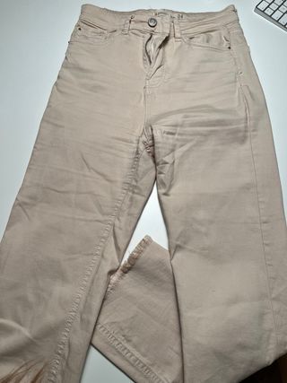 Pantalón vaquero campana de Stradivarius en color beige. Corte acampanado y bajo deshilachado. Talla 34 - Cintura alta. - Cierre de cremallera y botón. - Bolsillos delanteros y traseros.