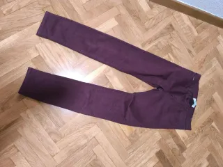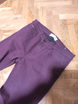 Pantalones de corte pitillo en color granate. Talla 38. Tipo vaquero, cierre de cremallera y botón. Bolsillos delanteros y traseros.