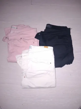 Conjunto de tres pantalones Stradivarius para mujer. - Un pantalón de color rosa. - Un pantalón de color negro. - Un pantalón de color blanco.