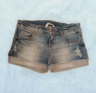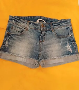 Calções de ganga curtos da Stradivarius. - Cintura subida. - Bolsos frontais e traseiros. - Acabamento desfiado na bainha. - Detalhes rasgados. Calções de ganga azuis Stradivarius, tamanho 38, modelo curto com bainha dobrada e efeito “destroyed”/desgastado à frente. Perfeitos para looks de verão ou para usar com collants em meia estação #portugal #calçoesdeganga #pantalonescortos #shortenjean #shortejeans #denimshorts