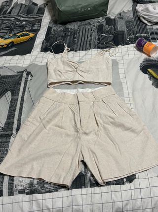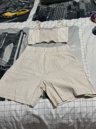 Conjunto de dos piezas compuesto por un top y un pantalón corto. Puesto solo 1 vez para una comunión. Tengo la americana a juego, si interesa preguntar😊👍🏻 - Tejido de lino. - Diseño moderno y fresco.