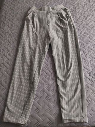 Pantalones de Stradivarius con un diseño de rayas verticales. - Diseño de rayas blancas sobre fondo gris. - Corte recto y favorecedor. - Cintura elástica para mayor comodidad.