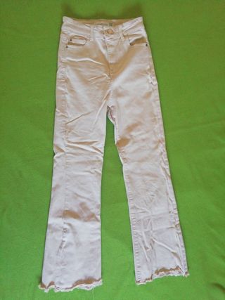 Pantalón vaquero de corte moderno. Aunque es la 40 creo que el tallaje es más bajo ( una 38). - Color blanco. - Detalle de rotos en la pierna izquierda.
