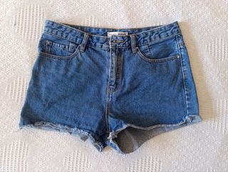 Shorts vaqueros de Stradivarius en color azul. Talla 40 - Cintura alta. - Bajo deshilachado. - Bolsillos delanteros y traseros.
