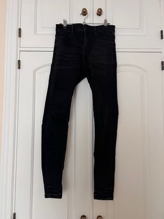 Pantalón skinny tiro alto vaquero negro con puntitos blancos. Talla 36.
