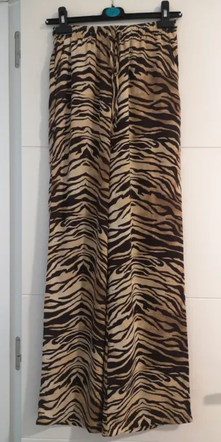 Pantalón fluido de pierna ancha en tonos marrón y beige. Cinturilla elástica, con cordón ajustable. Tiene bolsillos laterales. Marca Stradivarius. Talla XS. Como nuevo, usado solo una vez un rato.