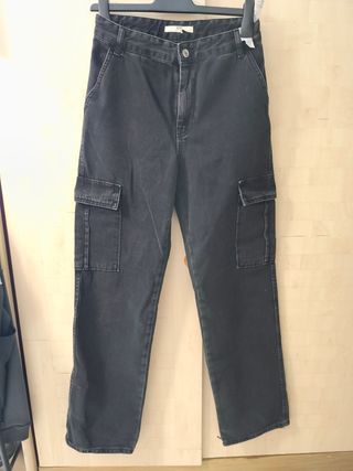 Pantalones vaqueros estilo cargo en color negro. - Diseño de corte recto. - Bolsillos cargo en los laterales. - Cierre de botón y cremallera.