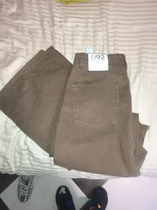 Jeans modelo straight wide fit de tiro alto en color marron. Piernas rectas y anchas. Mide de cintura 36cm, el tiro delantero 28cm y el trasero 37cm, de largo 115cm y la anchura de los bajos 26cm. Esta nuevo sin haber sido estrenado nunca, aun con su etiqueta puesta.