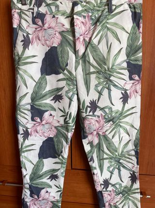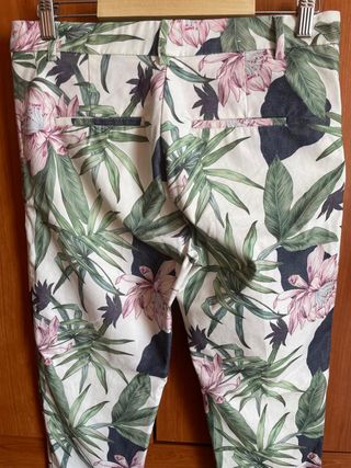 Pantalón pitillo con un llamativo estampado floral sobre fondo blanco. Su diseño es moderno y alegre. Nuevo, sin estrenar. - Corte pitillo. - Estampado de flores y hojas tropicales. - Cintura con trabillas.