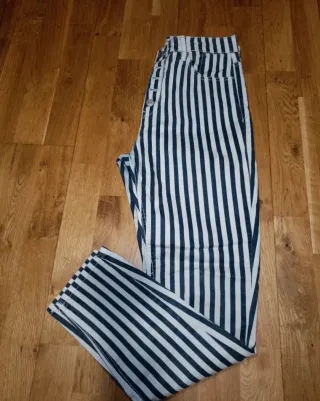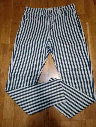 Pantalón de rayas verticales en blanco y azul de Stradivarius, talla 38 (EUR). ✔ Corte skinny ajustado ✔ Cintura media ✔ Tela elástica y cómoda ✔ Favorece la figura y combina genial con camisetas básicas o blusas 📌 En muy buen estado, sin marcas de uso. 📦 Ideal para looks de entretiempo o verano.