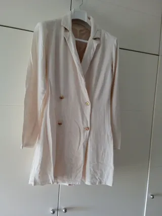 Blazer con pantalón incorporado de corte clásico en color beige. Muy elegante - Doble abotonadura. - Cuello solapa. - Bolsillos frontales. Tela rugosa Es una L pequeña. Queda por encima de la rodilla