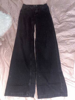 Pantalones vaqueros negros con un diseño de brillos sutiles y perforaciones. - Diseño acampanado. - Detalle de brillos por toda la prenda. - Perforaciones decorativas en las perneras.