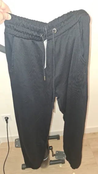 Pantalón de chándal negro de Stradivarius, con etiqueta. Aunque pone Xl es como una talla más pequeña, es mas estrecho. Por eso pongo medidas cadera y cintura - Cintura elástica con cordón ajustable. - Bolsillos laterales. - Bajo de pierna ajustado.