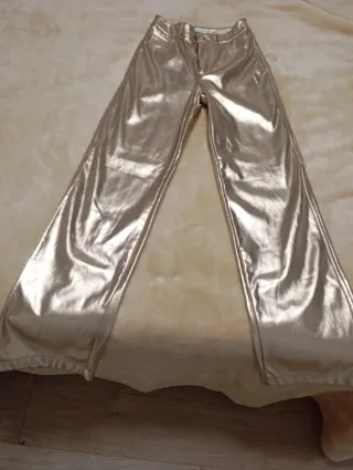 Pantalón con un llamativo efecto piel en tono dorado. Su diseño es moderno y elegante. - Efecto piel brillante. - Corte ancho en las piernas.