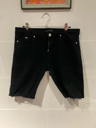 Pantalón corto de tela vaquera en color negro. Presenta un corte deshilachado en el bajo (porque era largo y lo corté a mano, queda muy bien, casual) - Cintura con trabillas para cinturón. - Cierre de cremallera y botón. - Bolsillos delanteros y traseros. Está conservado y en buen estado.