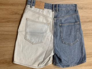 Shorts vaqueros de Stradivarius con un diseño original. - Diseño bicolor: mitad blanco, mitad azul. - Cintura alta. - Bolsillos delanteros y traseros.