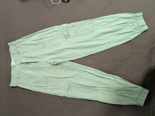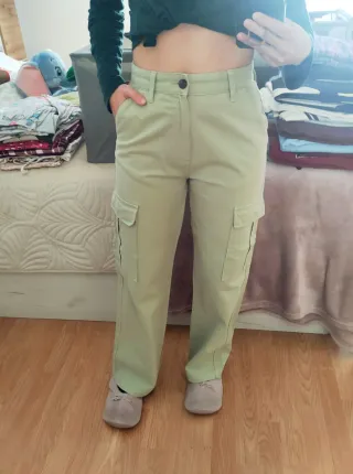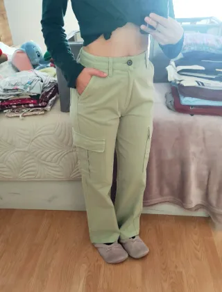 Pantalón de estilo cargo en color verde. - Diseño con múltiples bolsillos. - Cintura con trabillas para cinturón. - Cierre de botón y cremallera. Puesto solamente dos o tres veces. Lo vendo porque me queda muy apretado y ya no me gusta como me queda. Pero es súper chulo.