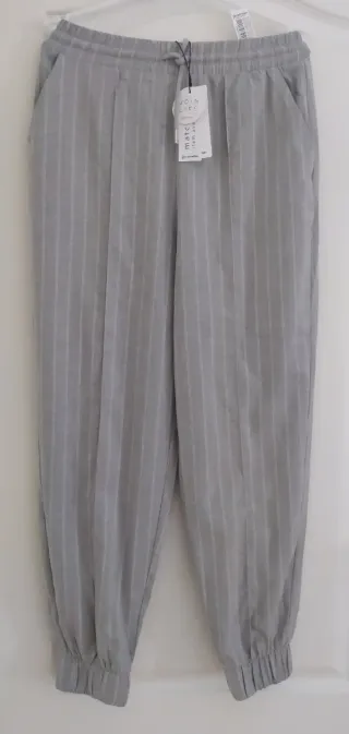 Pantalones tipo chándal de Stradivarius. Cintura con cordón ajustable. Puños elásticos en los tobillos. Diseño liso con costura en el centro. Medidas: 98 cm largo 36 cm cintura (elástica)