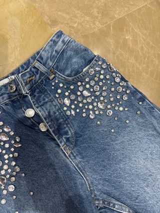 Pantalón vaquero de corte recto con detalles de pedrería. - Diseño con pedrería plateada en la zona de los bolsillos. - Cierre de botones. - Tejido vaquero.