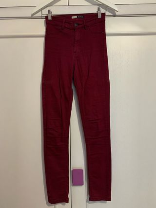 Pantalones de corte ajustado en color rojo burdeos. - Cintura alta. - Cierre de cremallera y botón. - Bolsillos delanteros y traseros. - Cintura con trabillas para cinturón. Con varios usos.