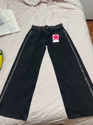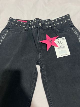 Pantalones vaqueros con tachuelas, están en muy buen estado porque no los he usado casi. Color negro, tachuelas rematadas, no pegadas, o sea que no se caen. Talla 40, válidos para talla M y L