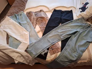 Pack de cinco pantalones. - Dos vaqueros claros, uno con rotos. - Unos vaqueros negros - Unos pantalones de estampado de serpiente. Unos blancos