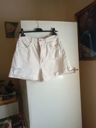 Pantalones cortos de tela en tono blanco con detalles desgastados. - Diseño con rotos. - Cintura alta. - Bolsillos delanteros y traseros.