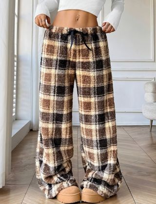 Pantalones rectos de forro polar con un diseño de cuadros en tonos beige y marrón. Son cómodos y suaves al tacto. Pantalones rectos de mujer con forro polar de cuadros con detalle de lazo - Pantalones informales largos para otoño/invierno, patrón marrón y blanco a cuadros, cintura cómoda con cordón, perfectos para ropa informal, pantalones de invierno. ELIJE LOS ARTICULOS QUE NECESITAS Y LE ARMAMOS UN PACK Y SOLO PAGAS UN ENVÍO. 3 O MÁS ARTÍCULOS TE HACEMOS UN 10% DE DESCUENTO EN TU PACKS. - Cintura con cordón ajustable. - Piernas anchas y rectas. - Tejido de forro polar mullido.