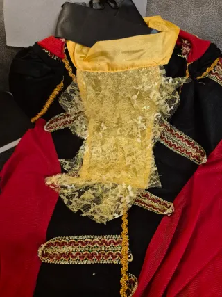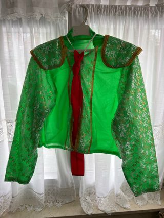 Disfraz de carnaval para adulto, Duende -Chaqueta sisa 65 vale para una XL Largo 84 -Pantalón cintura 30 estirada 55 Largo 82 Es corto porque va con medidas. Pero faltan - dos piezas: camiseta y pantalón. - Camiseta con cuello grande y detalles decorativos. - Mangas y pantalón de color amarillo