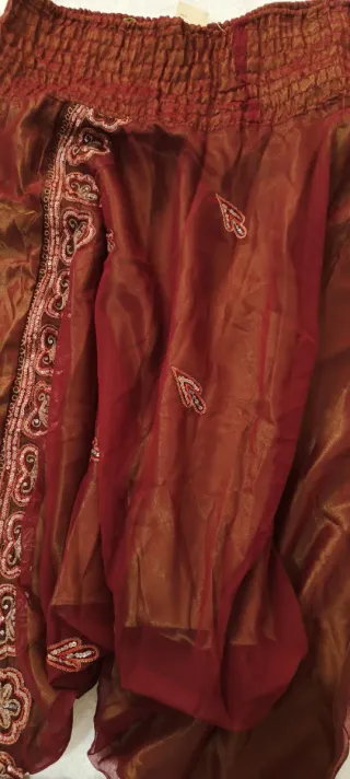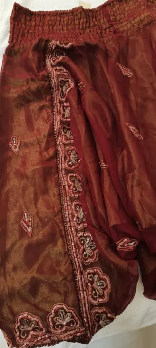 Pantalón de estilo árabe con detalles bordados y lentejuelas. - Cintura elástica. - Diseño fluido y ligero. - Adornos en los borde Al no llevar elástico da hasta las 2xl.