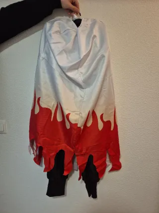 Disfraz de Rengoku con diseño de llamas. - Capa blanca con detalles de fuego. - Pantalones negros. - Gorro a juego con diseño de fuego.