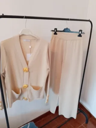 Conjunto de punto en color beige, ideal para cualquier ocasión. Es una pieza versátil y cómoda. - Tejido suave al tacto. - Diseño elegante y moderno. - Incluye cinturón para ajustar a la cintura.