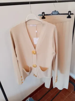 Conjunto de punto compuesto por cárdigan y pantalón. - Cárdigan con botones dorados. - Bolsillos delanteros. - Pantalón de corte recto.