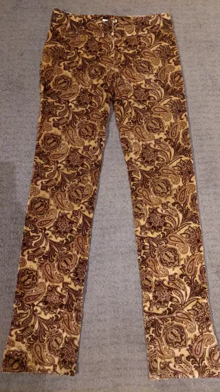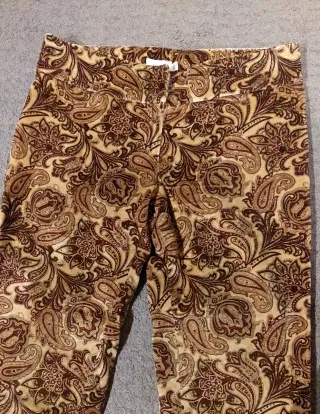 Pantalón de terciopelo con un llamativo estampado inspirado en cachemir. El diseño combina tonos beige y marrones para un look único. Es talla M, puede valer tambien para talla L. Es muy largo, puede servir para mujeres muy altas. Llama la atención. - Estampado de cachemir. - Corte recto.