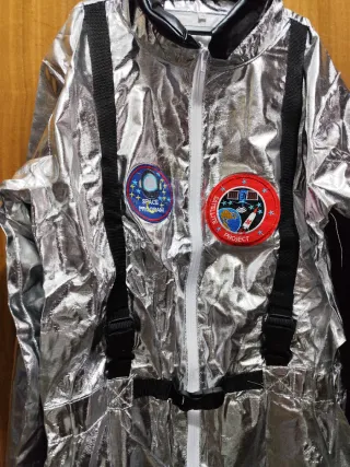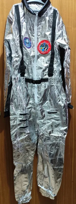 Disfraz de astronauta con un diseño brillante y detalles que recuerdan a un traje espacial. - Diseño plateado y negro. - Cierre frontal con cremallera. - Parches decorativos en el pecho. - Cinturón ajustable. - Bolsillos en la parte delantera de los pantalones.