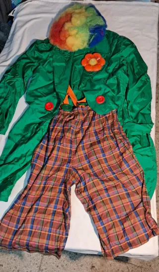 Disfraz de payaso único, creado a mano con atención al detalle. Perfecto para fiestas o eventos. - Chaqueta verde brillante. - Pantalones a cuadros multicolores. - Peluca de payaso con colores vibrantes. - Adorno de flor naranja en la chaqueta.
