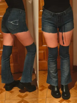 • 👖 Pantalón corto vaquero Stradivarius • 🔹 Denim azul con acabado desgastado • ✂️ Customizado a mano, pieza única • 🔽 Bajo desflecado para un look casual y moderno • 🧵 Calentadores vaqueros a juego, hechos con el mismo tejido • 🔔 Diseño acampanado en el bajo (estilo Y2K / festival) • 💃 Puede usarse en conjunto o por separado • 🔥 Ideal para looks urbanos, alternativos o festivales • 💎 Tejido resistente y de buena calidad 📏 Talla: 38 (M) 🏷 Marca base: Stradivarius 📦 Estado: Muy bueno
