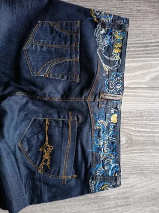 Pantalones vaqueros con un diseño único y llamativo. - Detalle de bordados florales en los laterales. - Bolsillos traseros con costuras decorativas. - Estilo moderno y original.