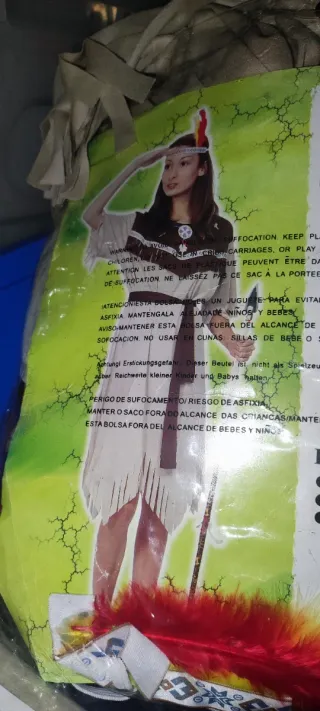 Disfraz de indio para adulto, ideal para fiestas temáticas o Halloween. Incluye varias piezas para un look completo. - Túnica con detalles tribales. - Pantalones a juego. - Cinturón. - Cinta para la cabeza con pluma. Los dos 30, sueltos 15 cada uno.